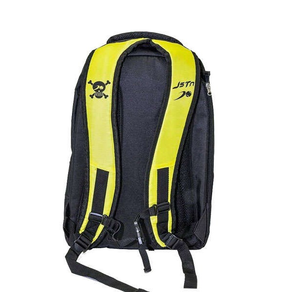 Mochila de pádel Just Ten en color amarilla y negra,especial para jugadores de pádel que necesitan transportar gran cantidad de complementos a sus espaldas. Diseñada con 5 compartimentos diferenciados, respaldo con tiras acolchadas para que no notes sobre cargas en la espaldas.